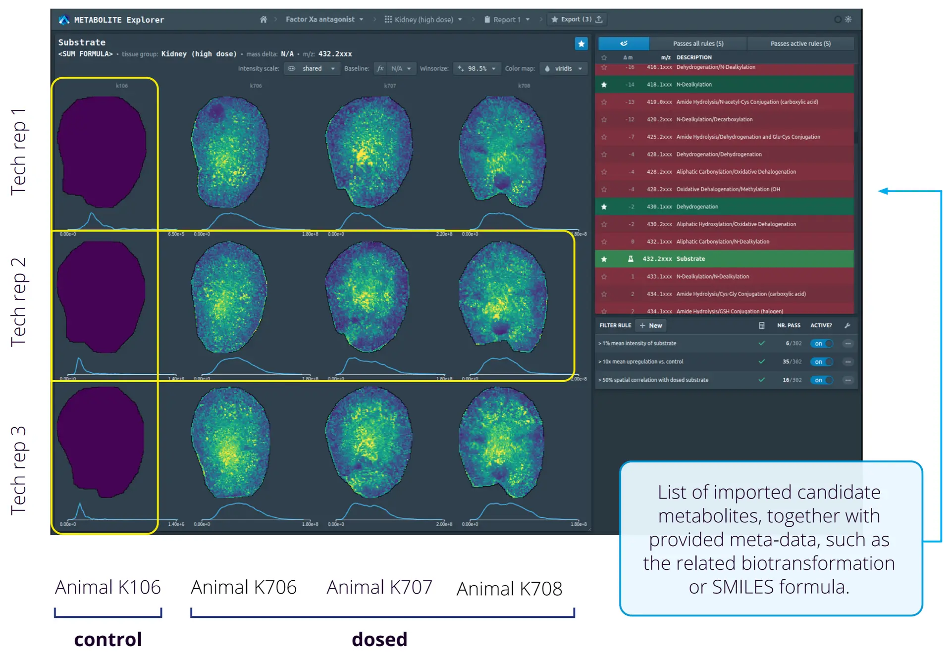 As with other MSI applications, analysis of metabolomics datasets can include co-registration of the MSI data with histological annotations and statistical analysis of the overall data. But of course, you’d want to assign specific peaks to metabolite identifications, which is possible when using high mass-resolving instruments. Developed in collaboration with top pharmaceutical company Boehringer Ingelheim 21, Metabolite Explorer is a web-based tool from Aspect Analytics designed to simplify the high-throughput, targeted screening analysis of drugs, biomarkers and other candidate molecules from multiple MSI experiments, while also enhancing standardization and reproducibility across studies. Metabolite Explorer allows the structured comparison of MSI experiments by using meta-information related to the experimental study, such as the samples measured (e.g., animal number, dosage level) and metabolites of interest (e.g., SMILES formulas, relevant bio-transformations). Users can then create and configure their own screening criteria, such as stratifying groups for statistical analysis and filters for relevant ion images, e.g., detect an upregulation of specific ions in treated samples vs. controls.